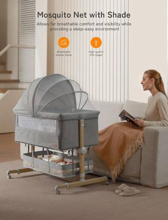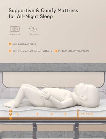 ✅ Supportive & Comfy Mattress: besrey baby bassinet sleeper is designed with a spacious sleeping area (34”x20”) for infants from 0-5 MONTHS, the soft skin-friendly peachskin covered 3D upright cotton mattress, and firm medium-density fiberboard, provide comfort with just the right amount of support, protecting your baby's spine while growing
