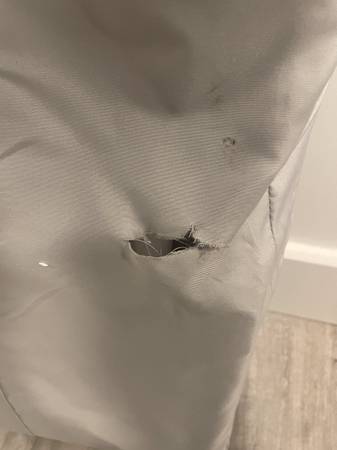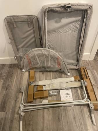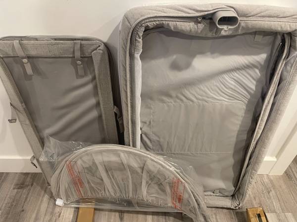 New, in opened box. One small tear to the carrying bag, no damage at all to the sleeper itself.