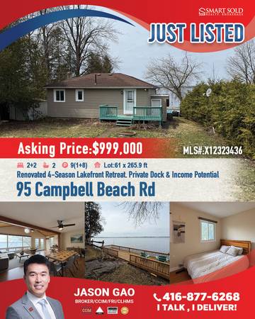 Move-in ready waterfront retreat! Address: 95 Campbell Beach Rd, Lake Dalrymple Asking Price: $999,000 2+2 Bedrooms, open-concept living room, floor-to-ceiling windows Walk-out basement with...